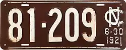 1920–21 Embossed white serial on brown plate; white lines at top and bottom borders; "NC" monogram and "6-30 1921" at right none 123-456 1 to approximately 131-000