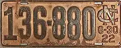 1921–22 Embossed black serial on white plate with border line; "NC" monogram and "6-30 22" at right none 123-456 1 to approximately 213-000