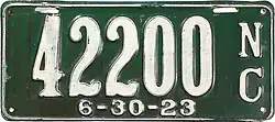 1922–23 Embossed white serial on green plate with border line; vertical "NC" at right and "6-30-23" centered at bottom none 123456 1 to approximately 181000