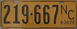 1925–26 Embossed black serial on orange plate with border line; diagonal "NC" and "6-30-26" at right none 123-456 1 to approximately 348-000