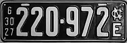 1926–27 Embossed white serial on black plate with border line; "NC" monogram and horsepower class at right; "6 30 27" at left none 123-456 1 to approximately 421-000 Horsepower classes were A (over 35 hp), B (31-35 hp), C (26-30 hp) and E (25 hp and under); a block of serials was assigned to each class, with E having the biggest block. This continued through 1928.