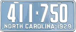 1929 Embossed white serial on sky blue plate with border line; "NORTH CAROLINA-1929" at bottom none 123-456 100-001 to approximately 580-000 First use of the full state name. Horsepower classes same as 1926–28 but no letter used for the 25 hp and under class; for the other classes, the letter was carried at the right of the plate. This happened again in 1930.