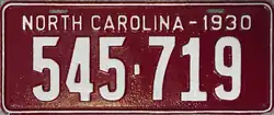 1930 Embossed white serial on maroon plate with border line; "NORTH CAROLINA–1930" at top none 123-456 100-001 to approximately 607-000
