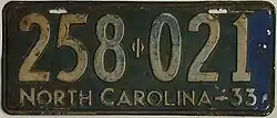 1933 Embossed white serial on dark blue plate; "NORTH CAROLINA–33" at bottom none 123-456 100-001 to approximately 464-000
