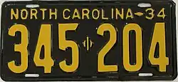 1934 Embossed yellow serial on black plate; "NORTH CAROLINA–34" at top none 123-456 100-001 to approximately 493-000