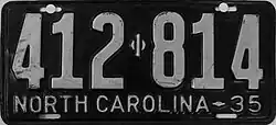 1935 Embossed silver serial on black plate; "NORTH CAROLINA–35" at bottom none 123-456 100-001 to approximately 518-000