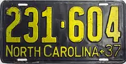 1937 Embossed yellow serial on black plate; "NORTH CAROLINA–37" at bottom none 123-456 200-001 to approximately 651-000 Serials 100-001 through 200-000 reserved for trucks; this practice continued through 1946.[4]