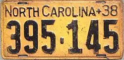 1938 Embossed black serial on yellow plate; "NORTH CAROLINA–38" at top none 123-456 200-001 to approximately 646-000