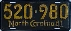 1941 Embossed golden yellow serial on black plate; "North Carolina 41" centered at bottom none 123-456 200-001 to approximately 775-000