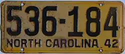 1942–43 Embossed black serial on golden yellow plate; "NORTH CAROLINA 42" at bottom none 123-456 200-001 to approximately 762-000 Revalidated for 1943 with black tabs, due to metal conservation for World War II.