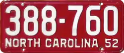 1952 Embossed white serial on red plate; "NORTH CAROLINA 52" at bottom none 123-456 100-001 to