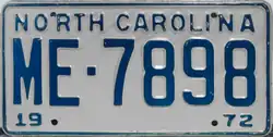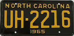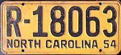 The U.S. state of North Carolina first required its residents to register their motor vehicles in 1907. Registrants provided their own license plates for display until 1913, when the state began to issue plates.[1]