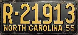 1955 Embossed golden yellow serial on black plate; "NORTH CAROLINA 55" at bottom none 123-456 100-001 to 760-000