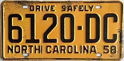 1958 As 1956 base, but with "NORTH CAROLINA 58" at bottom "DRIVE SAFELY" as on 1956 base A-1234