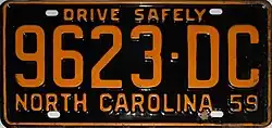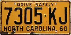 1953 Embossed golden yellow serial on black plate; "NORTH CAROLINA 53" or "N.C.", slogan and "53" at bottom (see right) none, or "DRIVE SAFELY" between state abbreviation and year 123-456 100-001 to