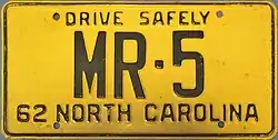 1962 As 1956 base, but with "62 NORTH CAROLINA" at bottom "DRIVE SAFELY" as on 1956 base A-1234