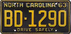 1963 Embossed golden yellow serial on black plate with border line; "NORTH CAROLINA 63" at top "DRIVE SAFELY" centered at bottom A-1234