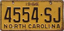 1966 Embossed black serial on golden yellow plate with border line; "1966" centered at top; "NORTH CAROLINA" at bottom none A-1234