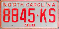 1968 Embossed red serial on reflective white plate with border line; "NORTH CAROLINA" at top; "1968" centered at bottom none A-1234