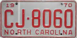 1970 Embossed red serial on reflective white plate with border line; "19" at top left and "70" at top right; "NORTH CAROLINA" at bottom none A-1234