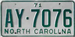 1971 Embossed green serial on reflective white plate with border line; "71" centered at top; "NORTH CAROLINA" at bottom none A-1234