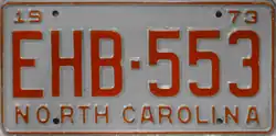 1973 Embossed red serial on reflective white plate with border line; "19" at top left and "73" at top right; "NORTH CAROLINA" at bottom none ABC-123 AAA-101 to approximately HVA-999