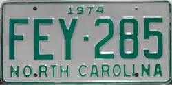 1974 Embossed green serial on reflective white plate with border line; "1974" centered at top; "NORTH CAROLINA" at bottom none ABC-123 AAA-101 to approximately JBA-999