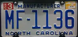 Manufacturer Embossed blue on white with border line; "NORTH CAROLINA" at bottom; "MANUFACTURER" at top MF-1234 MF-1001 to present