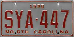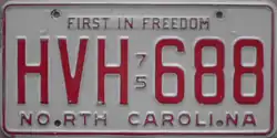 1975–78 Embossed red serial on reflective white plate with border line; vertical "75" used as separator; "NORTH CAROLINA" at bottom "FIRST IN FREEDOM" centered at top ABC-123 AAA-101 to approximately PMZ-999 First base to be revalidated with stickers. Monthly staggered registration introduced 1981.[5] Plates from AAA-101 through JAY-999 replaced 1982; all other plates replaced by 1992.