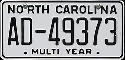 Multi-Year Trailer 1993–present Embossed black on white with border line; "NORTH CAROLINA" at top; "MULTI YEAR" at bottom AB-12345