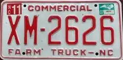 Farm Truck Embossed red on white with border line; "COMMERCIAL" at top; "FARM TRUCK–NC" at bottom WB-1234