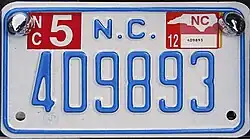Motorcycle 1999–present Embossed blue on white with border line; "N.C." at top 1A2345 1A0001 to present Letter advances before leftmost number (1A-1Z, 2A-2Z, etc.). G, I, O, Q and U not used. Issuing 9C series as of May 5, 2024.