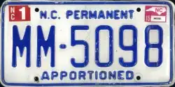 Apportioned Truck 2006–present Embossed blue on white with border line; "N.C. PERMANENT" at top; "APPORTIONED" at bottom LB-1234