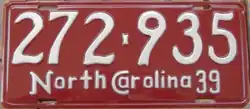 1939 Embossed silver serial on maroon plate; "North Carolina 39" centered at bottom none 123-456 200-001 to approximately 686-000