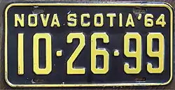1964–65 | Embossed yellow serial on black plate with border line; "NOVA SCOTIA '64" at top | none | 1-23-45 12-34-56 |