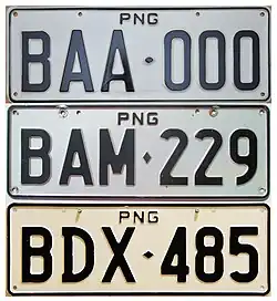 In about 1993, Papua New Guinea began using a letter system to denote the Province of registration. General issue type issued in the National Capital District (NCD), as denoted by the B prefix. Manufacturing variations exist. BAA-000 to BAK-000 were manufactured by Altona Industries and made of steel. BAL-000 onwards were made of aluminium. |