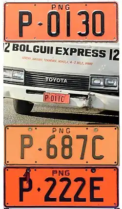 | Plates with a red Z and in the range ZPD-000 to ZPD-999 and ZPF-000 to ZPF-999 are issued to police vehicles of the Royal Papua New Guinea Constabulary. |