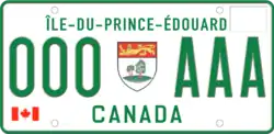 2022–present | Green letters on white baseplate; 'PRINCE EDWARD ISLAND' screened at top. Provincial crest separator in centre and small Canadian state flag in bottom left. | CANADA | 123★ABC | Default version for Anglophone Prince Edward Islanders.[3] | |