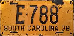 1937–38 Embossed black serial on golden yellow plate; "SOUTH CAROLINA 38" at bottom none A·12·345 Letter corresponds to weight class