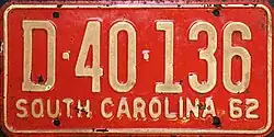 1962 Embossed white serial on red plate with border line; "SOUTH CAROLINA 62" at bottom none A-123456 Letter corresponds to weight class