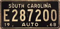 1968 Embossed white serial on black plate with border line; "SOUTH CAROLINA" and "AUTO" centered at top and bottom respectively; "19" at bottom left and "68" at bottom right none A 123456 Letter corresponds to weight class