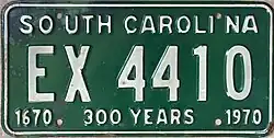 1970 Embossed white serial on green plate with border line; "SOUTH CAROLINA" at top "300 YEARS" centered at bottom, with "1670" to the left and "1970" to the right A 123456