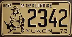 1973 | Black on tan with border line; black embossed prospector at left with gold paint speck; "YUKON 73" at bottom | Home of the Klondike | 1234 | 1 to approximately 7000 | |