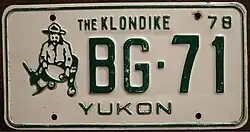 1978 | Green on white with border line; green embossed prospector at left with gold paint speck; "YUKON" centred at bottom and "78" at top right | The Klondike | AB-12 | Coded by region (A) | Manufactured in Saskatchewan using that province's serial dies. This practice continued until 1990. |