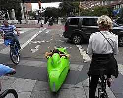 Two-wheel "streamliner" configurations can have much less aerodynamic drag: wheels are hard to make aerodynamic; each wheel entry/exit to the fairing adds drag; and velomobiles with two front wheels are necessarily wider or longer than the rider, while two-wheel streamliners can be barely wider than the rider. A common way to describe aerodynamic drag is "CdA"; in one comparison of racing cycles, there were several two-wheel streamliners with less than half the CdA drag of the best three-wheeler.[17] Air drag is most significant for high-speed events; as of 2016, the world record for a 200-metre sprint on near-level ground is about 145 km/h for a two-wheel streamliner and about 120 km/h for any vehicle with more than two wheels,[18] meaning the two-wheel vehicle was about 20% faster. Aerodynamic power is roughly cubic in speed, so at lower speeds the difference is much less pronounced. At the same time, two-wheel streamliners require a way to stay upright when stopped and at very low speed, and are more sensitive to blowing over in cross-winds. These factors limit the use of streamliners, despite their aerodynamic advantage.