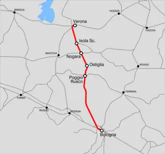 The Verona–Bologna railway is a major Italian railway connecting Verona and Bologna and part of the major axis from the Brenner railway to the Bologna–Florence and on to Rome. The line is part of the Line 1 of Trans-European Transport Networks (TEN-T). It is considered a "fundamental" line by the state railways Ferrovie dello Stato (FS).[4]