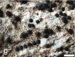 The perithecia are small to medium-sized (0.15–0.47 mm in diameter) and partially immersed in the rock substrate, usually leaving shallow to fairly deep pits. They occur in relatively high densities, with 60–200 perithecia per square centimetre.[2]