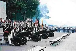 Members of the Veteran Corps of Artillery have served in several wars and military actions involving the United States including World War I, World War II, the Korean War, the Vietnam War, as well as Desert Storm and the present WOT conflicts in Iraq and Afghanistan. Members have served in all of the United States military branches, and many VCA members are still serving actively in either the regular branches or the National Guard or reserves including the NY (State) Guard.[27] As noted in its web site, the current mission of the corps is to "preserve the military heritage of the State of New York and to support military activities in the State of New York upon request". The corps today serves primarily as a ceremonial unit, and during the course of its drill year, is invited to participate in numerous New York City parades, civic and patriotic events. Independently or in association with traditional veterans organizations, the corps also serves as honor guard and provides firing parties for military funerals, military anniversaries and other events of military interest. Drills and practice are held in several locations such as the 7th Regiment Armory, Jamaica Armory in Jamaica, Queens, and Camp Smith. Their drill season begins in October with the Columbus Day Parade, and ends with the corps "4th of July" salute to the nation. Here they render an artillery salute from its salute battery of 75 mm pack howitzers. This practice began on July 4, 1794, when the corps fired its first Federal Artillery Salute from the Battery in New York City[7] in celebration of U.S. Independence. Other events that they participate in during the drill year include: