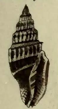 The white shell has chestnut bands, or is dark colored with white bands. The acute shell is oblong-fusiform. Its acute whorls show revolving striae between the ribs. The shell consists of nine whorls, angulate at the sutures. The anterior part of the body whorl is slightly umbilicate and recurved. The columella contains four plaits. The outer lip is slightly angulate.[2][3]