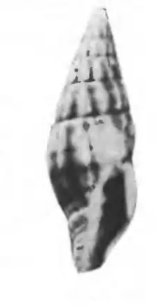 (Original description) The small, slender shell has a fusiform shape. The protoconch consists of about two smooth, glassy whorls, followed by about seven sculptured whorls. The early whorls of the spire are nearly flat, the later whorls slightly more convex. The suture is lightly impressed. The sculpture consists of broad, rounded, slightly curved, axial ribs that are regularly spaced, 10 or 11 on the body whorl. Weak spiral striae are present in the depressions between axial ribs. The aperture is elongate and shorter than spire;.The columella has four inclined folds. Traces of four dark bands of color are discernible on the Body whorl, the highest one thinner than the other three.[2]